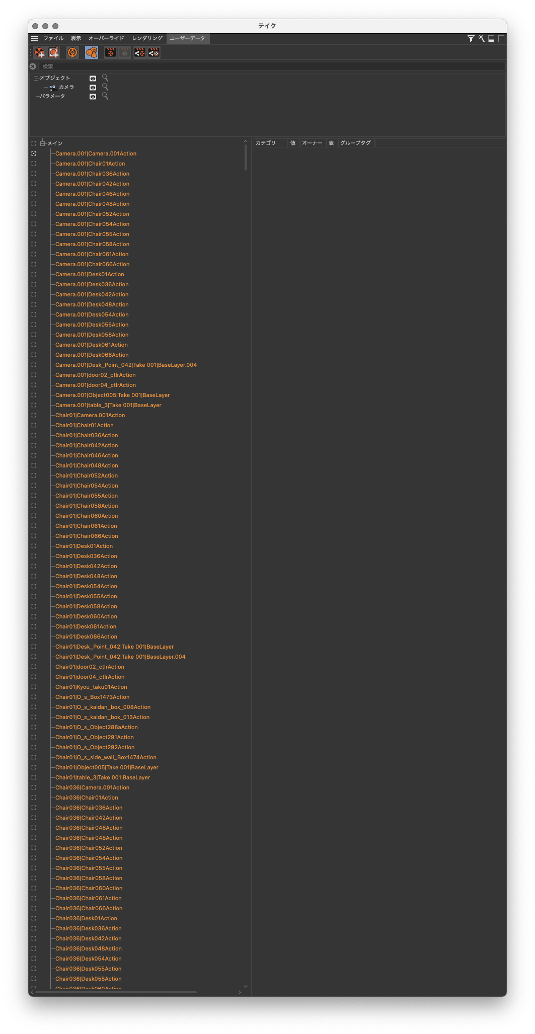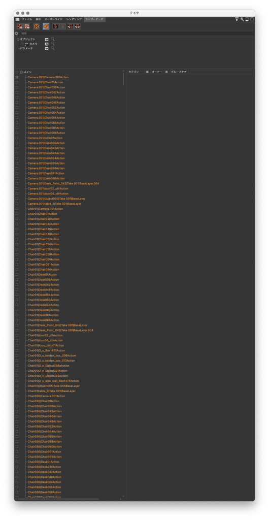 C4Dでインポートするととんでもない量のテイクが含まれている。
