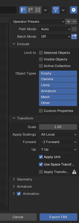 BlenderからFBXエクスポートする際の設定は多くありません。