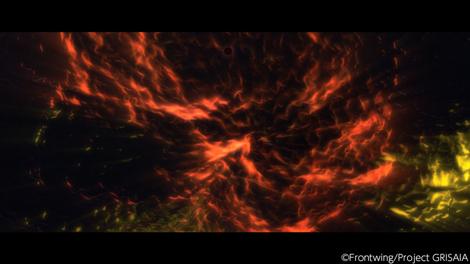 グリザイアの果実では、1話のカット001という物語の導入部を担当させていただきました。 水面、林檎共に3DCGで作成しました。 水面は波を作成するモジュールをベースに、海中から海面を見上げた場合に綺麗に見えるよう調整しています。 3D空間を物語の設定に合わせて設計し、光源からの反射、屈折も計算に入れ設計しています。 レンブラント光線やマリンスノー、泡などはコンポジット時に3Dデータから出力した座標データを元にAfterEffectsで作成しました。